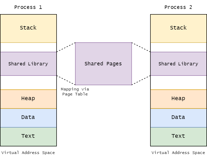 Shared Library를 사용할 때는 프로세스의 Virtual Address가 같은 Physical Address를 가리키는 방식으로 구현된다.