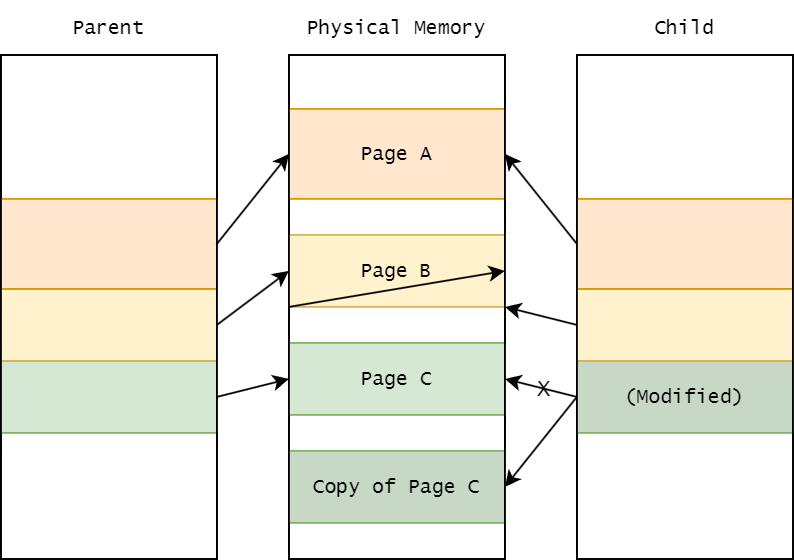 Copy-on-Write 방식은 우선 fork가 실행되면 생성된 Child는 Parent의 메모리를 공유한다. 그리고 exec나 Memory Write 명령이 있는 경우 그때야 공유된 부분 중 Write 된 Page의 복사본을 할당해 준다. 이러면 Parent와 다른 Page만 따로 저장해 메모리를 절약할 수 있다.