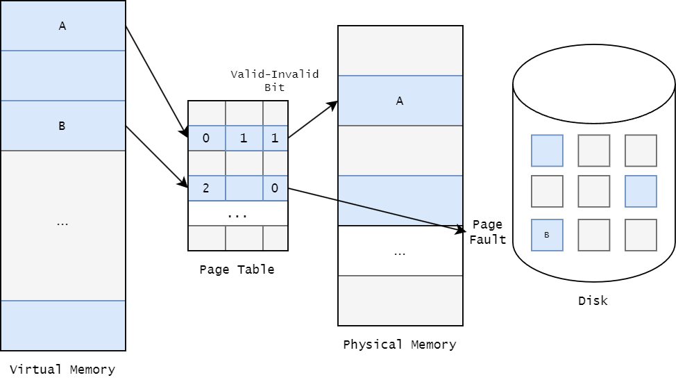 Valid -Invalid Bit를 통해 현재 Physical Memory에 해당 Page가 있는지(1) 확인하고, 없다면(0) Page Fault를 일으켜 다음 단계로 넘어간다.