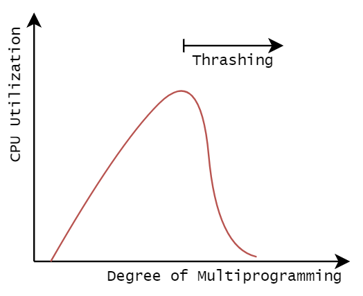 실행 중인 프로세스가 증가할 수록 남아 있는 Frame이 줄어들면서 Thrashing이 자주 일어나게 된다.