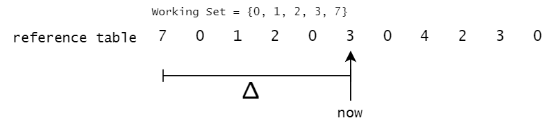 그러면 지금까지 $\Delta$시간 동안 사용된 Page는 프로세스가 특정 시간 동안 사용하는 Page라고 볼 수 있다.