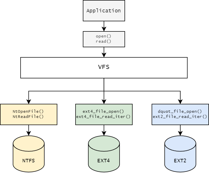 프로그램이 open(), write()와 같은 명령어를 수행하면, 디스크의 포맷을 확인하고 포맷에 맞는 명령어를 수행한다.