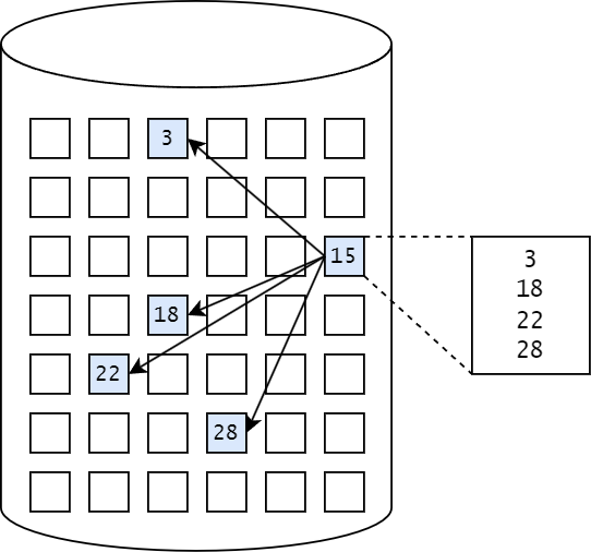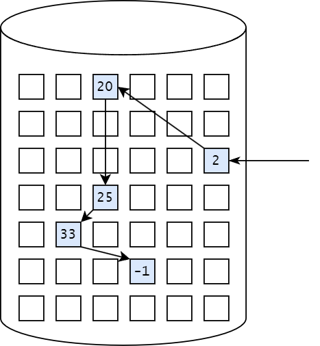 시작 Block 주소만 기억하면 되는 단순한 방법이지만 Random Access가 불가능하고, Pointer를 저장할 공간이 추가로 필요하다.