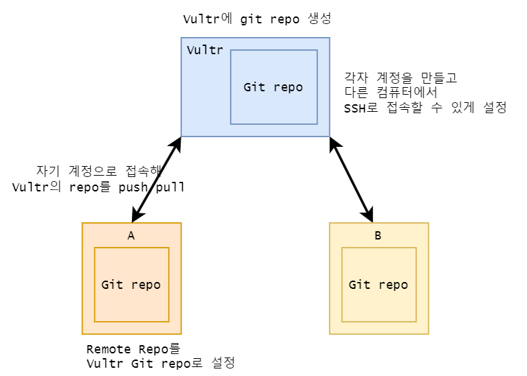그 후 다시 내 컴퓨터로 돌아와 프로젝트 폴더를 git init한 뒤, Remote Repository를 {내 계정이름}@{Vultr 서버 주소}:{프로젝트 폴더 위치}로 지정했다.