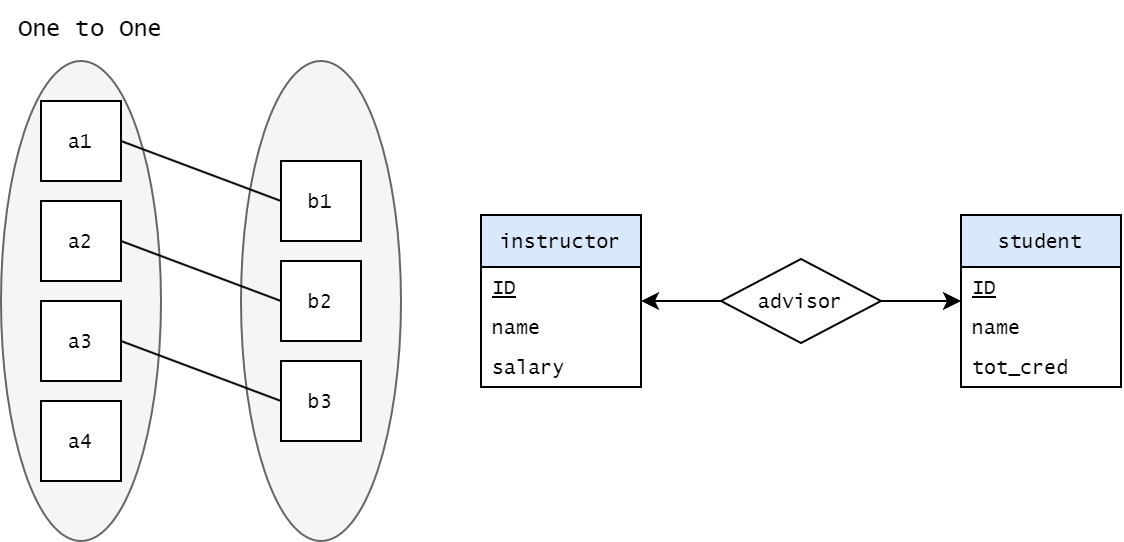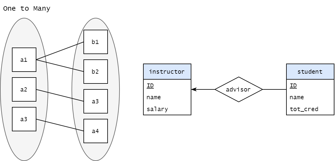 예를 들어, 아래 그림은 Instructor Entity들과 Student Entity들이 Advisor라는 관계로 연결되어 있다고 할 수 있다.