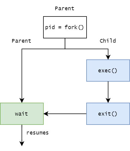 분기 이후에 Child가 다른 프로그램을 실행하려면, exec 시스템 콜을 실행해 메모리 내용을 리셋해 새 프로그램을 로드한다.