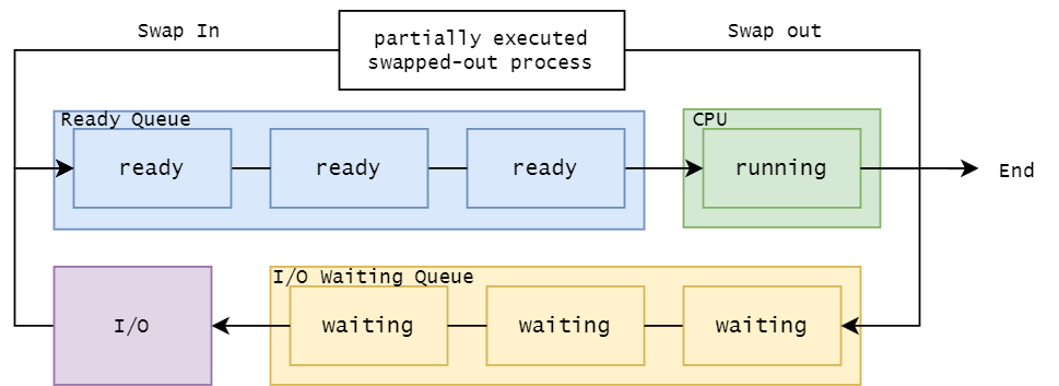 프로세스는 running 상태에서 다른 프로세스로 주도권이 넘어가 ready 상태가 되거나, I/O를 기다리는 waiting 상태가 된다. 이 프로세스들은 각각 Ready Queue와 Device Queue (I/O Waiting Queue)에 저장되어 자기 차례가 되면 큐에서 나와 running이나 ready 상태가 된다.
